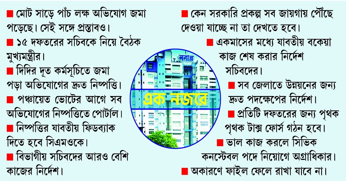 মুখ্যমন্ত্রী এদিন স্বরাষ্ট্র, অর্থ, শ্রম, শিক্ষা, নগরোন্নয়ন, কৃষি, স্বাস্থ্য, খাদ্য বণ্টন, সংখ্যালঘু উন্নয়ন, ভূমি সংস্কার, অনগ্রসর শ্রেণি, পূর্ত দফতর, পঞ্চায়েত, শিশু ও সমাজ কল্যাণ এবং সিএমওর সচিব ও শীর্ষ আধিকারিকদের নিয়ে বৈঠক করেন। এই সব দফতর একাধিক জনকল্যাণ প্রকল্পের সঙ্গে যুক্ত রয়েছে। সূত্র মারফত খবর, সরকারি প্রকল্পের সুবিধা সব মানুষের কাছে ঠিকঠাক না পৌঁছনোর কারণে সচিবদের সঙ্গে বৈঠকে উষ্মাপ্রকাশ করেছেন মুখ্যমন্ত্রী। প্রতিটি দফতরের জন্য আলাদা আলাদা টাস্ক ফোর্স গঠন করে সমস্যা সমাধানের নির্দেশ দিয়েছেন তিনি। পাশাপাশি মুখ্যমন্ত্রীর দফতরের গ্রিভান্স সেলে যেসব অভিযোগ জমা পড়ে রয়েছে, সেগুলি খতিয়ে দেখে দ্রুত নিষ্পত্তির দিকে নজর দেওয়ার জন্য নির্দেশ দেওয়া হয়েছে বলে জানা যাচ্ছে। মুখ্যমন্ত্রীর দফতরে যেসব অভিযোগ আসে, সেই অভিযোগগুলি সংশ্লিষ্ট দফতরে পাঠানো হয়।