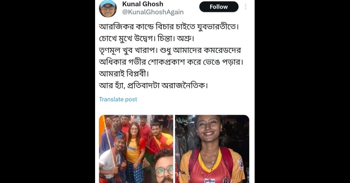 সেদিন প্রতিবাদে শামিল হয়েছিলেন বিভিন্ন রাজনৈতিক দলের পরিচিত কিছু মুখ। প্রতিবাদে ধরা পড়েছে বাম-রাম যুগলবন্দির ছবি। প্রাক্তন তৃণমূল সাংসদ কুণাল ঘোষ মঙ্গলবার এক্স হ্যান্ডেলে দু’টি ছবি পোস্ট করেন। যেখানে একটি ফ্রেমে দেখা যাচ্ছে, বিনোদন জগতের দুই বামপন্থী রাজনৈতিক ব্যক্তিত্ব ঊষসী চক্রবর্তী ও সৌরভ পালোধিকে। তাঁরা আরজি কর-কাণ্ডের বিচার চাইতে এসে গুটিকয়েক লোকজন নিয়ে হাসিমুখে সেলফি তুলছেন। চোখে-মুখে কোথাও সমবেদনার ছাপ পর্যন্ত নেই। অন্য একটি ছবিতে দেখা যাচ্ছে লোকসভা ভোটে জামানত বাজেয়াপ্ত হওয়া সিপিএম প্রার্থী দীপ্সিতা ধরকে। তিনিও হাসিমুখে পোজ দিতেই ব্যস্ত। তাঁরা নাকি প্রতিবাদী! এ-প্রসঙ্গে কুণাল ঘোষ সাফ জানান, কোনও প্রকৃত ক্রীড়াপ্রেমী জার্সি পরে রাজনৈতিক স্লোগান দিতে পারেন না। হাসিমুখে কমরেডরা সেলফি তুলতে গিয়েছিলেন, ফটোসেশন করছিলেন। এরা সব বাম-বিজেপির অতৃপ্ত আত্মা। তিনি ছবি দিয়ে এক্স হ্যান্ডেলে ক্যাপশন দেন, আরজি কর-কাণ্ডে বিচার চাইতে যুবভারতীতে। চোখে-মুখে উদ্বেগ। চিন্তা। অশ্রু। তৃণমূল খুব খারাপ। শুধু আমাদের কমরেডদের অধিকার গভীর শোকপ্রকাশ করে ভেঙে পড়ার। আমরাই বিপ্লবী। আর হ্যাঁ, প্রতিবাদটা অরাজনৈতিক।