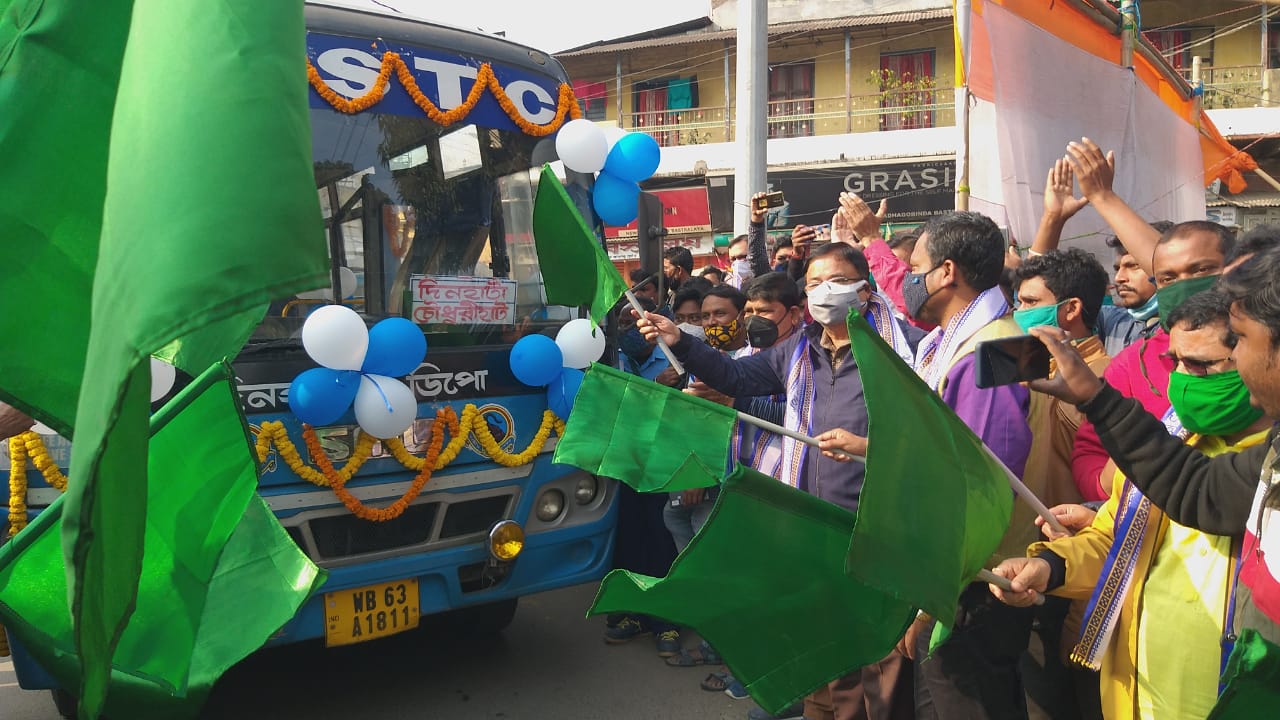 সংবাদদাতা, কোচবিহার : দীর্ঘদিন বন্ধ থাকার পর অবশেষে দিনহাটা থেকে চৌধুরিহাটগামী উত্তরবঙ্গ (North Bengal) রাষ্ট্রীয় পরিবহণ সংস্থার সরকারি বাস-পরিষেবা চালু হল। শনিবার দিনহাটা শহরের পাঁচমাথা মোড় থেকে এই বাস-পরিষেবার আনুষ্ঠানিক সূচনা করেন উত্তরবঙ্গ রাষ্ট্রীয় পরিবহণ সংস্থার চেয়ারম্যান পার্থপ্রতিম রায়। বিধায়ক উদয়ন গুহ, বিষ্ণুকুমার সরকার, পঞ্চায়েত সমিতির সভাপতি বীরেন বর্মন, পুর প্রশাসকমণ্ডলীর চেয়ারম্যান গৌরীশংকর মাহেশ্বরী। উল্লেখ্য, দিনহাটা থেকে ভারত-বাংলাদেশ সীমান্ত এলাকার চৌধুরিহাট যাওয়ার জন্য উত্তরবঙ্গ (North Bengal) রাষ্ট্রীয় পরিবহণ সংস্থা বাস চালালেও দীর্ঘদিন ধরে বন্ধ ছিল এই বাস-পরিষেবা।