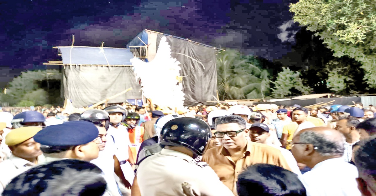 সংবাদদাতা, চন্দননগর: চন্দননগরে ভেঙে পড়ল সবথেকে বড় জগদ্ধাত্রী প্রতিমার মণ্ডপ। কলকাতা দেশপ্রিয় পার্কের আদলে সবথেকে বড় জগদ্ধাত্রী প্রতিমা করা হয়েছিল কানাইলালপল্লি এলাকায়। সেই মণ্ডপেরই একটা অংশ হুড়মুড়িয়ে ভেঙে পড়েছে। ঘটনায় ৭ জন জখম বলে প্রাথমিকভাবে খবর। এই অবস্থায় ওই মণ্ডপ দর্শনার্থীদের জন্য বন্ধ রাখা হয়েছে। ঘটনার পরেই মুখ্যমন্ত্রীর নির্দেশে এলাকায় ছুটে যান বিধায়ক তথা মন্ত্রী ইন্দ্রনীল সেন ও মেয়র রাম চক্রবর্তী।