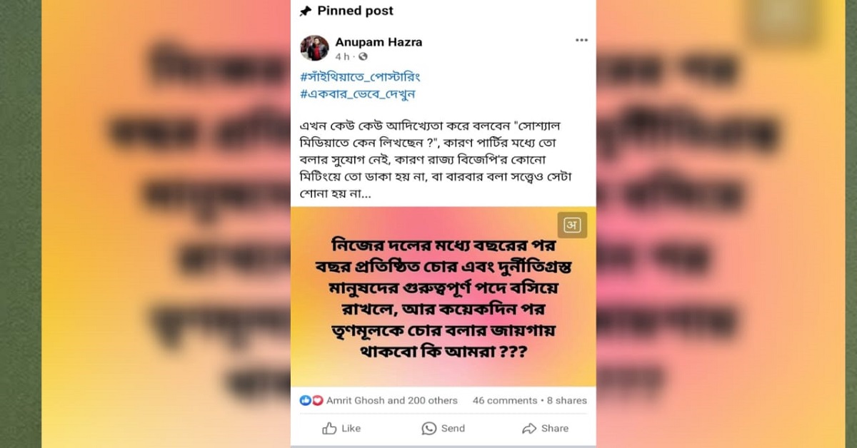 কিছু নেতাকে দুর্নীতিগ্রস্ত বলে কামান দাগতেও শুরু করেছেন। তার ফলে অমিত শাহর সভায় তিনি ডাক পাননি। সেটা নিয়েও তার গোসা হয়। রবিবার সাঁইথিয়া ফের বিজেপির গোষ্ঠীদ্বন্দ্ব নিয়ে সরগরম। জেলা সাংগঠনিক সভাপতি ধ্রুব সাহার বিরুদ্ধে পোস্টারও দেখা যায়। তারপরই সোশ্যাল মিডিয়ায় পোস্ট করে অনুপম হ্যাশট্যাগ দিয়ে লেখেন, এখন কেউ কেউ আদিখ্যেতা করে বলবেন ‘সোশ্যাল মিডিয়াতে কেন লিখছেন?’, কারণ পার্টির মধ্যে তো বলার সুযোগ নেই, কারণ রাজ্য বিজেপি’র কোনও মিটিংয়ে তো ডাকা হয় না, বা বারবার বলা সত্ত্বেও সেটা শোনা হয় না…’। শুধু তাই নয়, তাঁর নিজস্ব থ্রেডে তিনি লেখেন, ‘নিজের দলের মধ্যে বছরের পর বছর প্রতিষ্ঠিত চোর এবং দুর্নীতিগ্রস্ত মানুষদের গুরুত্বপূর্ণ পদে বসিয়ে রাখলে, আর কয়েকদিন পর তৃণমূলকে চোর বলার জায়গায় থাকব কি আমরা???’