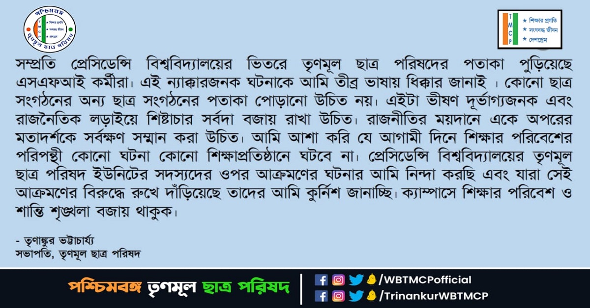 প্রতিবেদন : তৃণমূল ছাত্র পরিষদের পতাকা পোড়ানোকে কেন্দ্র করে গত কয়েকদিন ধরে উত্তপ্ত হয়ে রয়েছে প্রেসিডেন্সি বিশ্ববিদ্যালয় চত্বর। একই সঙ্গে বামপন্থী ছাত্র সংগঠনের হাতে হেনস্তার শিকার হয়েছেন টিএমসিপি সদস্য সমর্থকরা। বিশ্ববিদ্যালয়ের টিএমসিপি নেতৃত্বকে কুরুচিকর ভাষায় তীব্র আক্রমণও করা হয়, দেওয়া হয়েছে হুমকিও। এই পরিস্থিতিতে গোটা ঘটনার তীব্র নিন্দা করলেন টিএমসিপির রাজ্য সভাপতি তৃণাঙ্কুর ভট্টাচার্য। সোমবার টুইটারে তিনি লেখেন, সম্প্রতি প্রেসিডেন্সি বিশ্ববিদ্যালয়ের ভিতর টিএমসিপির পতাকা পুড়িয়েছে এসএফআই কর্মীরা।