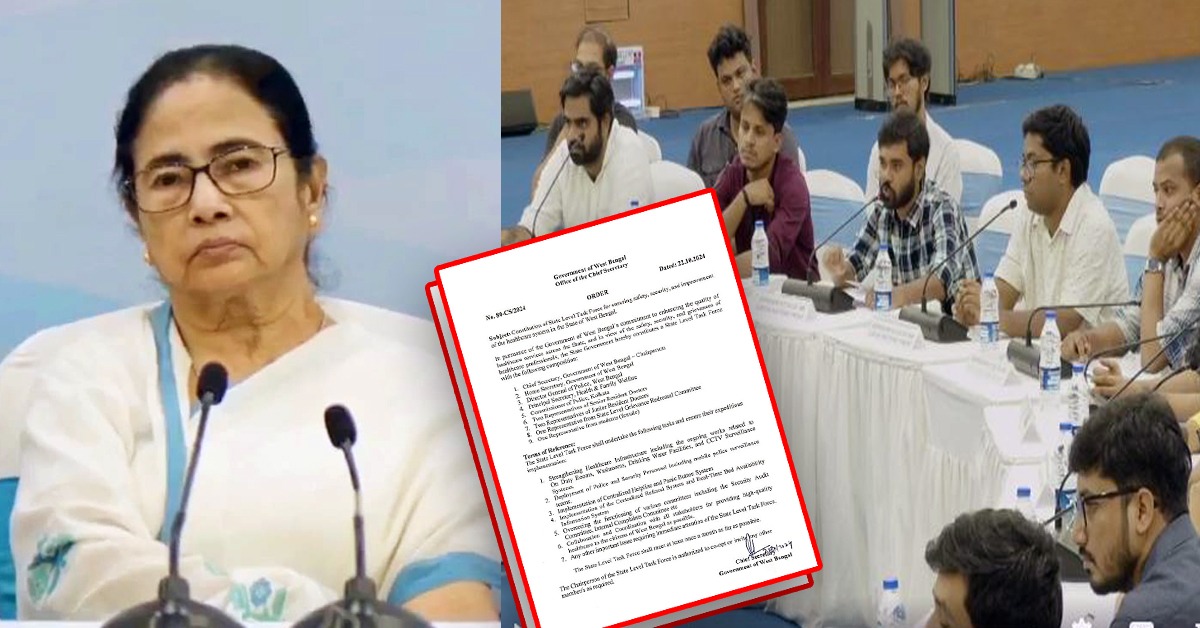 রাজ্যের স্বাস্থ্যক্ষেত্রে জটিলতা কাটাতে সোমবার আন্দোলনরত জুনিয়র ডাক্তারদের সঙ্গে বৈঠকে বসেছিলেন মুখ্যমন্ত্রী। ২ ঘণ্টা ১১ মিনিটের বৈঠকে হাসপাতালের নিরাপত্তা-সহ একাধিক বিষয়য়ে আলোচনা হয়। মুখ্যমন্ত্রীর হস্তক্ষেপেই গতকাল সন্ধেয় অনশন প্রত্যাহারের কথা জানান অনশনকারী জুনিয়র ডাক্তাররা। তারপরই টাস্ক ফোর্স গঠনের জন্য এদিন দুপুরে বিজ্ঞপ্তি জারি করল নবান্ন।
