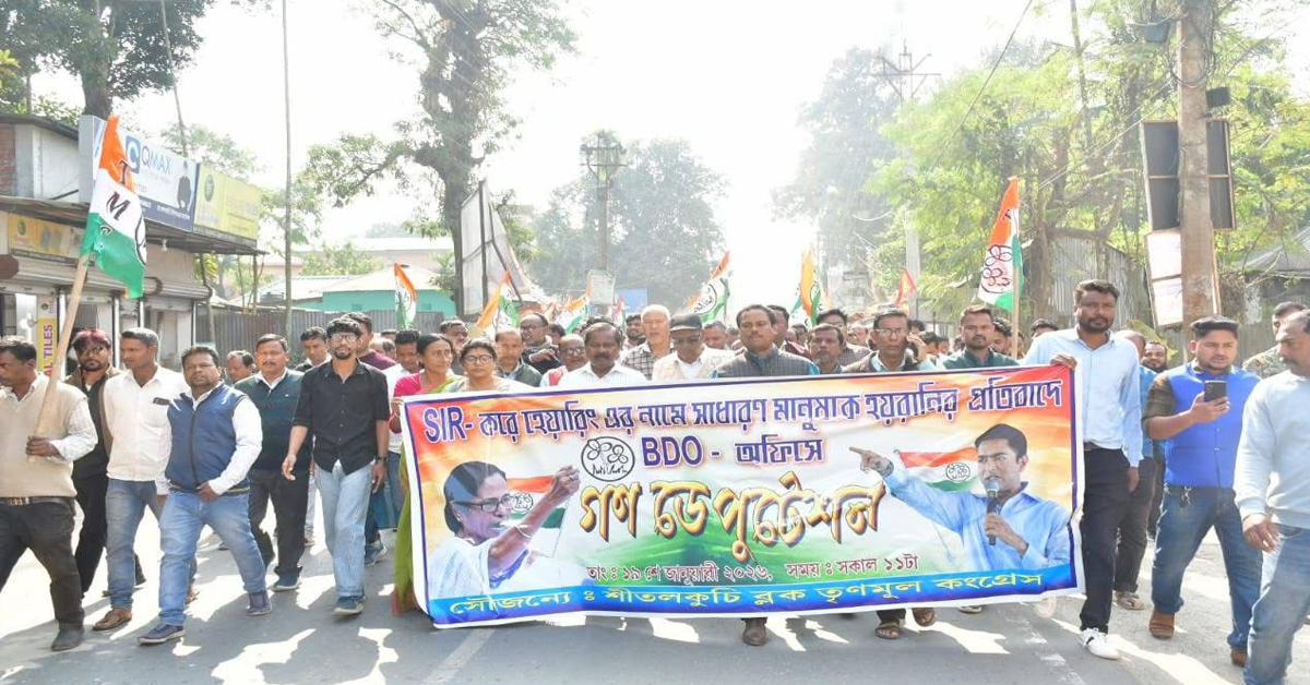 ব্যুরো রিপোর্ট: শুনানির নামে হয়রানির প্রতিবাদে রাজ্যজুড়ে গর্জে উঠেছে তৃণমূল (ECI_TMC)। সোমবার মালদহ, কোচবিহার, রায়গঞ্জে ধিক্কার জানিয়ে চলল স্মারকলিপি প্রদান। হল প্রতিবাদের মিছিল ও অবস্থানও। এদিন কোচবিহারের শীতলকুচি বিডিও অফিসে গণ ডেপুটেশন কর্মসূচি পালন করল তৃণমূল কংগ্রেস। শীতলকুচি ব্লক তৃণমূল কংগ্রেসের (ECI_TMC) দলীয় কার্যালয় থেকে একটি মিছিল শুরু হয়ে বিডিও অফিসে এসে শেষ হয়। মিছিল ও গণ ডেপুটেশনকে ঘিরে বিডিও অফিস চত্বরে মোতায়েন ছিল কড়া পুলিশি নিরাপত্তা। এই কর্মসূচিতে উপস্থিত ছিলেন কোচবিহার জেলা তৃণমূল কংগ্রেসের চেয়ারম্যান গিরীন্দ্রনাথ বর্মন, তৃণমূল কংগ্রেসের মুখপাত্র পার্থপ্রতিম রায়, শীতলকুচি ব্লক তৃণমূল কংগ্রেস সভাপতি তপন কুমার গুহ, সাধারণ সম্পাদক মদন বর্মন-সহ দলের অন্যান্য নেতা-কর্মীরা। মাথাভাঙা ২ ব্লক বিডিও অফিসের সামনে এসআইআর-এর নামে হয়রানি এবং ভোটাধিকার কেড়ে নেওয়ার চক্রান্তের অভিযোগ তুলে অবস্থান বিক্ষোভে শামিল হল মাথাভাঙা ২ ব্লক যুব তৃণমূল কংগ্রেস। মালদহের ইংরেজবাজারে পথে নামে তৃণমূল। এই আন্দোলনে নেতৃত্ব দেন মালদহ জেলা তৃণমূল কংগ্রেসের নেত্রী সুমালা আগরওয়ালা,আশিস কুণ্ডু, শুভময় বসু, গৌতম দাস ও শুভদীপ সান্যাল-সহ দলের অন্যান্য নেতারা। কালিয়াগঞ্জে এদিন এসআইআরের ফর্ম সেভেন জমা দেওয়াকে কেন্দ্র করে উত্তেজনা ছড়াল কালিয়াগঞ্জ বিডিও অফিস চত্বরে। পরিস্থিতি সামাল দিতে ঘটনাস্থলে ছুটে এল কালিয়াগঞ্জ থানার আইসি দেবব্রত মুখোপাধ্যায়ের নেতৃত্বে বিশাল পুলিশ বাহিনী৷ ব্লক প্রশাসন সূত্রে খবর, সোমবার কালিয়াগঞ্জ ব্লকের এসআইআর-এর ফর্ম সেভেনের জমা দেওয়ার শেষ দিন। ফলে এদিন দুপুরে কালিয়াগঞ্জ পুরসভার ৫ নম্বর ওয়ার্ডের বিজেপি কাউন্সিলর গৌতম বিশ্বাস ও ১১ নম্বর ওয়ার্ডের কাউন্সিলর পিয়ালি দাস সাহার স্বামী অমিত সাহা তাঁদের ওয়ার্ডের ফর্ম সেভেন জমা দিতে আসেন বিডিও অফিসে।