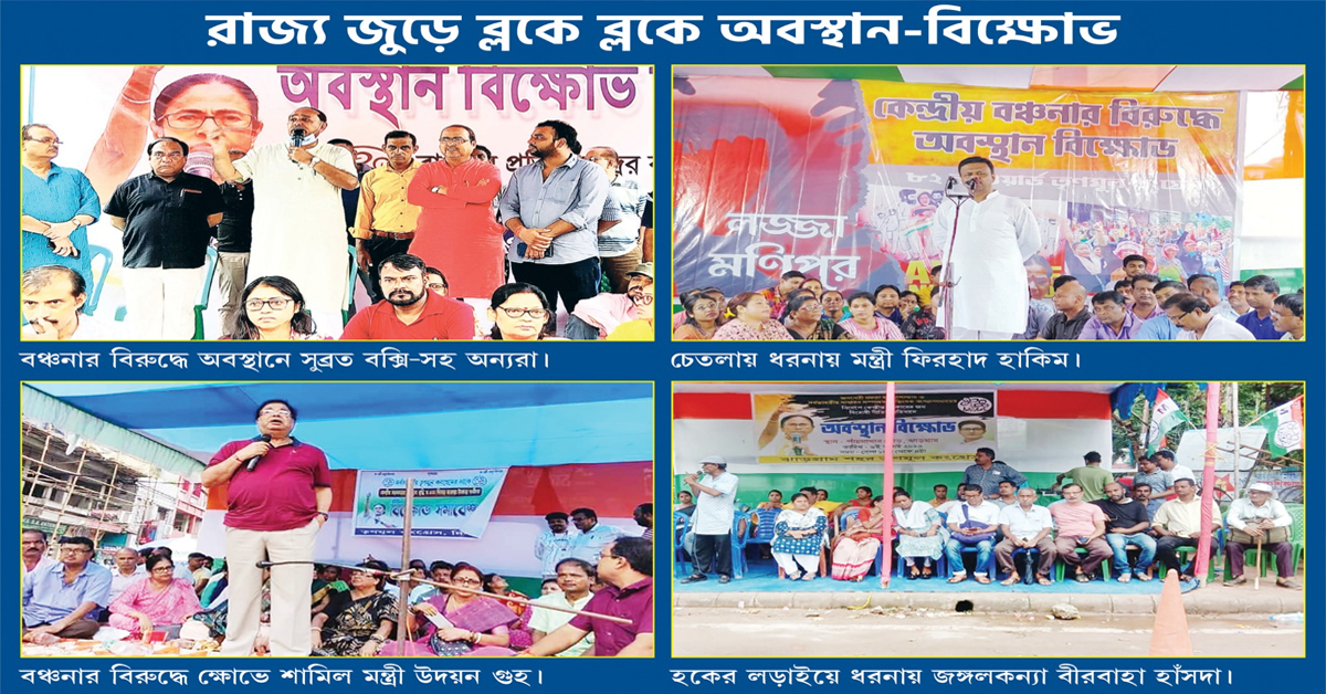 ১০০ দিনের কাজের বকেয়া টাকা ও আবাস যোজনার বকেয়া-সহ এখনও পর্যন্ত সব মিলিয়ে ১ লক্ষ কোটি টাকারও বেশি কেন্দ্রের কাছ থেকে পায় বাংলা। সেই বকেয়া আদায়ে আগামী ২ অক্টোবর থেকে দিল্লির বুকে লাগাতার প্রতিবাদ ধরনা চলবে। বাংলা থেকে যাবেন কয়েক লক্ষ লোক। তার আগে গোটা বাংলা জুড়ে আজ রবিবার ছিল এক প্রকার মহড়া। কলকাতার বিভিন্ন প্রান্তে ধরনা কর্মসূচিতে ছিলেন রাজ্য সভাপতি সুব্রত বক্সি, জয়প্রকাশ মজুমদার, মন্ত্রী ফিরহাদ হাকিম, শশী পাঁজা, চন্দ্রিমা ভট্টাচার্য, তাপস রায়, সাংসদ ডাঃ শান্তনু সেন, মালা রায়, বাবুল সুপ্রিয়, বৈশ্বানর চট্টোপাধ্যায়, অরূপ চক্রবর্তী, শান্তি কুণ্ডু, ভোলা চক্রবর্তী, কুণাল ঘোষ, অয়ন চক্রবর্তী, ঋজু দত্তরা। উত্তরের কোচবিহারে উত্তরবঙ্গ উন্নয়নমন্ত্রী উদয়ন গুহ (দিনহাটায়), জেলা সভাপতি অভিজিৎ দে ভৌমিক (হিপি), সুস্মিতা দত্ত শর্মারা বেলা ১২টা থেকে ধরনা শুরু করেন। ওই একই সময়ে আলিপুরদুয়ার, জলপাইগুড়ি, শিলিগুড়িতে প্রতিবাদ কর্মসূচিতে বসেন সুমন কাঞ্জিলালরা। শিলিগুড়িতে ধরনায় ছিলেন মেয়র গৌতম দেব ও জেলা সভানেত্রী পাপিয়া ঘোষ-সহ অন্যান্য নেতৃত্ব। এভাবে রায়গঞ্জ, মালদহ, মুর্শিদাবাদ, নদিয়া, বীরভূম, হাওড়া, হুগলি, উত্তর ও দক্ষিণ ২৪ পরগনা সর্বত্র বৃষ্টি উপেক্ষা করে ধরনা কর্মসূচি চলে।