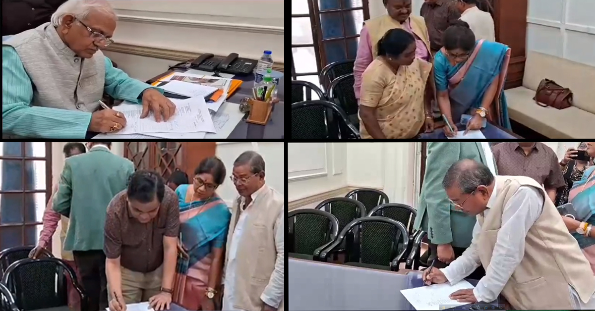 পরিষদীয় মন্ত্রী শোভনদেব চট্টোপাধ্যায়ের ঘরে লাইন দিয়ে সই করেন মন্ত্রী ব্রাত্য বসু, শশী পাঁজা, সুজিত বসু, বীরবাহা হাঁসদা, স্বপন দেবনাথ, বেচারাম মান্না, উজ্জ্বল বিশ্বাসরা।