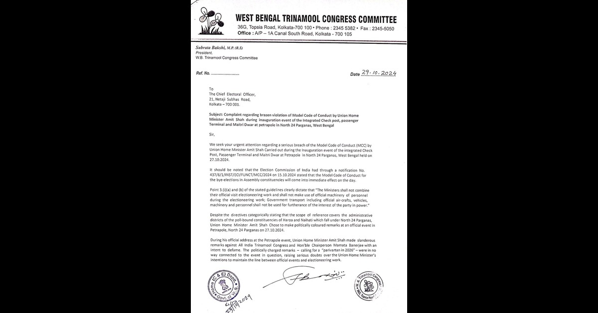 বাংলা সফরে এসে ২৭ অক্টোবর স্বরাষ্ট্রমন্ত্রী অমিত শাহ ইন্টিগ্রেটেড চেক পয়েন্ট, প্যাসেঞ্জার টার্মিনাল ও পেট্রাপোলে মৈত্রীদ্বার উদ্বোধন করেন। ‘মডেল কোড অফ কন্ডাক্ট’ লাগু থাকা সত্ত্বেও পেট্রাপোলের এই কর্মসূচি থেকে তিনি নির্বাচনী আচরণবিধি ভেঙেছেন। আবার দেশের স্বরাষ্ট্রমন্ত্রী সরকারি মঞ্চ থেকে পরিবর্তনের ডাক দিচ্ছেন। তৃণমূল জানিয়েছে, বাংলার মানুষ সব চালাকি বোঝে। তাই যতই সরকারি মঞ্চ থেকে নির্বাচনী প্রচার চালান না কেন, এই নির্বাচনেও খালি হাতে ফিরতে হবে বিজেপিকে! তৃণমূলের রাজ্য সহসভাপতি জয়প্রকাশ মজুমদার বলেন, আমরা স্বরাষ্ট্রমন্ত্রী অমিত শাহের বিরুদ্ধে তদন্তের দাবি করছি। নির্বাচন কমিশনের আদর্শ আচরণবিধি লাগু থাকা সত্ত্বেও সরকারি অনুষ্ঠান করে এবং সেই সরকারি মঞ্চ থেকে সর্বভারতীয় তৃণমূল কংগ্রেস ও মাননীয়া মুখ্যমন্ত্রী মমতা বন্দ্যোপাধ্যায়কে টার্গেট করেছেন স্বরাষ্ট্রমন্ত্রী। ধিক্কার স্বরাষ্ট্রমন্ত্রীকে।