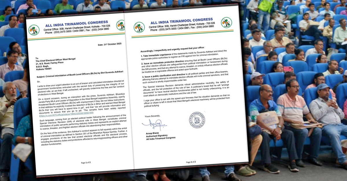 তৃণমূলের অভিযোগ, SIR প্রক্রিয়া ঘোষণার পর এমন হুমকি “ইচ্ছাকৃত রাজনৈতিক ভয় দেখানো” এবং “নির্বাচন প্রক্রিয়াকে প্রভাবিত করার প্রয়াস।” পাশাপাশি অভিযোগপত্র বলা হয়েছে, একজন নির্বাচিত জনপ্রতিনিধি যদি সরকারি কর্মীদের জেলে পাঠানোর হুমকি দেন, তা শুধু অগ্রহণযোগ্য নয়, গণতান্ত্রিক ব্যবস্থার প্রতি সরাসরি আঘাত। একই সঙ্গে তৃণমূলের অভিযোগ পত্রে জানানো হয়েছে তিন দফা দাবিও।