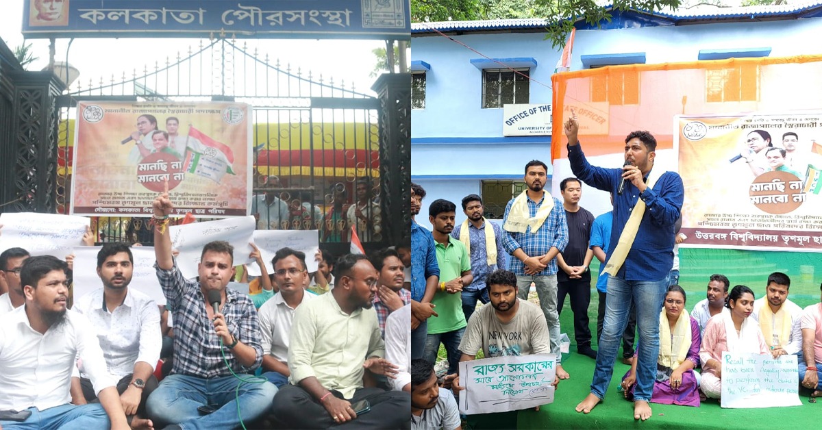 ডানদিকে উত্তরবঙ্গ বিশ্ববিদ্যালয় সামনে অবস্থানে ত্রিনাঙ্কুর ভট্টাচার্য। বাঁদিকে কলকাতা বিশ্ববিদ্যালয়ের সামনে অবস্থান