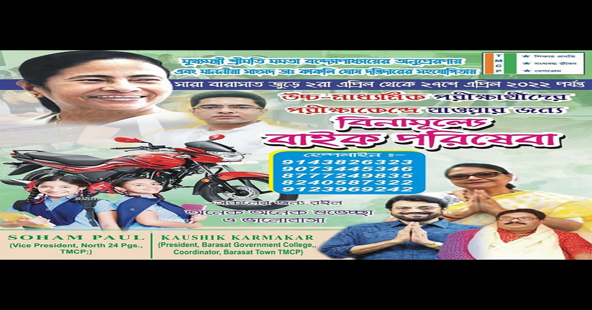 সংবাদদাতা, বারাসত : উচ্চমাধ্যমিক পরীক্ষার্থীদের হলে পৌঁছে দিতে বিনামূল্যে বাইক পরিষেবা। এই উদ্যোগ নিল টিএমসিপি বারাসত ইউনিট। পরীক্ষার শুরুর দিন থেকেই পরীক্ষার্থীদের জন্য এই পরিষেবা শুরু হয়েছে। এই পরিষেবা পেয়ে খুশি পরীক্ষার্থী ও অবিভাবকেরা।