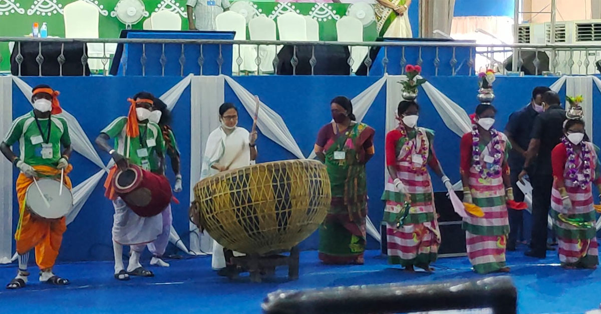 মিতা নন্দী, ঝাড়গ্রাম: বিশ্ব আদিবাসী দিবসে আদিবাসী উন্নয়নে কল্পতরু মুখ্যমন্ত্রী মমতা বন্দ্যোপাধ্যায়। সোমবার ঝাড়গ্রাম শহরের ঘোড়াধরা স্টেডিয়ামে ছিল বিশ্ব আদিবাসী দিবস পালনের অনুষ্ঠান। উদ্বোধন করেন মুখ্যমন্ত্রী মমতা বন্দ্যোপাধ্যায়। উদ্বোধনী অনুষ্ঠানে মুখ্যমন্ত্রী আদিবাসী শিল্পীদের সঙ্গে যেমন নাচের তালে পা মেলান, তেমনই ধামসা-খঞ্জনি বাজিয়ে অনুষ্ঠানকে বর্ণময় করে তোলেন।