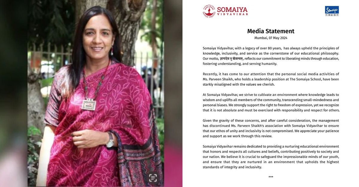 মঙ্গলবার গণমাধ্যমকে দেওয়া এক বিবৃতিতে মুম্বইয়ের বিদ্যাবিহার এলাকার সোমাইয়া স্কুলের তরফে বলা হয়, ‘এটা আমাদের নজরে এসেছে যে পারভীন শেখের সোশ্যাল মিডিয়া কার্যকলাপগুলি আমাদের মূল্যবোধগুলির বিরুদ্ধাচারণ করছে। এই ঘটনার পরিপ্রেক্ষিতে,পারভীন শেখকে পদত্যাগের নির্দেশ দেওয়া হয়েছে।’ স্কুলটি জানায় যে তারা “দৃঢ়ভাবে মত প্রকাশের স্বাধীনতার অধিকারকে সমর্থন করে” তবে এটি “দায়িত্বের সাথে প্রয়োগ করা উচিত” বলেই তারা মনে করেন।