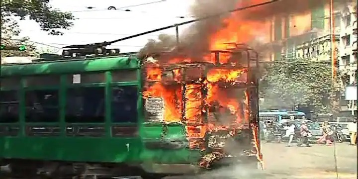 প্রতিবেদন: দাউ-দাউ করে জ্বলছে চলন্ত ট্রাম। প্রাণ বাঁচাতে ওই ট্রাম থেকে হুড়মুড়িয়ে নামার চেষ্টা করছেন যাত্রীরা। শুক্রবার সকালে নোনাপুকুর ট্রামডিপোর কাছে এজেসি বোস রোডের ঘটনা। আগুন নেভাতে ছুটে আসেন স্থানীয় এবং পথচারীরা। চালক দ্রুত ট্রামটি থামিয়ে দেন। এই ঘটনায় রীতিমতো আতঙ্ক ছড়িয়ে পড়ে। তবে পুলিশ, দমকল এবং পুরকর্মীদের তৎপরতায় যাত্রীদের অক্ষত অবস্থায় উদ্ধার করা সম্ভব হয়। শীততাপ নিয়ন্ত্রিত এক কামরার ট্রামটি গড়িয়াহাট থেকে ধর্মতলার দিকে যাচ্ছিল। এজেসি রোড থেকে বাঁদিকে ধর্মতলার রাস্তা ধরতেই আচমকা আগুন লেগে যায়।
