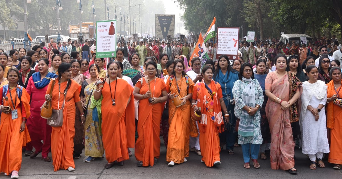 মিছিল শেষে মহিলা তৃণমূল কংগ্রেসের সভানেত্রী চন্দ্রিমা ভট্টাচার্য বলেন, সংবিধান তৈরির জন্য যে গণপরিষদ তৈরি হয়েছিল, ১৯৪৬ সালের ৯ ডিসেম্বর সেই গণপরিষদের প্রথম বৈঠক হয়। সেই গণপরিষদে ১৫ জনই ছিলেন মহিলা! অর্থাৎ মহিলাদের অগ্রাধিকার দেওয়া তখন থেকেই সংবিধানপ্রণেতাদের চিন্তাধারায় ছিল। ধর্ম-জাতি-শ্রেণির নিরিখে কোনও বিভাজন-বৈষম্য নয়, এটা সংবিধানের নিদান। কিন্তু আজকে কেন্দ্রের বিজেপি সরকার সেই সংবিধানকে পাল্টে নতুন করে সংবিধান লেখার অপচেষ্টা চালাচ্ছে। সংবিধানের শপথ নিয়ে সরকারে বসে এখন সেই সংবিধানকেই আক্রমণ করছে বিজেপি। সেই সংবিধানকে রক্ষার শপথ নিতেই আজকে আমরা পথে নেমেছি। জোট বাঁধো, তৈরি হও; বাংলার অধিকার রক্ষার শপথ নাও!