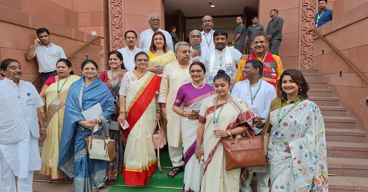 হ্যাঁ, অধিকাংশ সাংসদই শপথ নিলেন বাংলায়। শ্রীরামপুরের তৃণমূল সাংসদ কল্যাণ বন্দ্যোপাধ্যায় সংস্কৃতে চণ্ডীস্তোত্র পাঠ করে অবাক করে দিলেন সকলকে। তাঁর শপথের আগে স্লোগান ওঠে, খেলা হবে। শপথের শেষে সম্মিলিত কণ্ঠে শোনা যায়, জয় বাংলা। অলচিকিতে শপথবাক্য পাঠ করলেন ঝাড়গ্রামের সাংসদ কালীপদ সোরেন। জয়নগরের প্রতিমা মণ্ডল, বীরভূমের শতাব্দী রায়, যাদবপুরের সায়নী ঘোষ জয়ধ্বনি দিলেন নিজেদের কেন্দ্রের নামে।