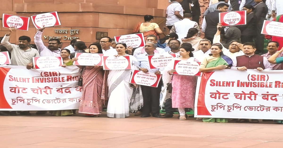 অন্য দিনের মতো মঙ্গলবার সংসদের বাইরে মকরদ্বারের সামনে তৃণমূল কংগ্রেস, কংগ্রেস, আরজেডি, শিবসেনা, ডিএমকে সাংসদরা সম্মিলিতভাবে এসআইআর প্রত্যাহারের দাবিতে এবং বিজেপির চুপিচুপি ভোট চুরির ষড়যন্ত্রের বিরোধিতায় ব্যানার হাতে সুর চড়ান।