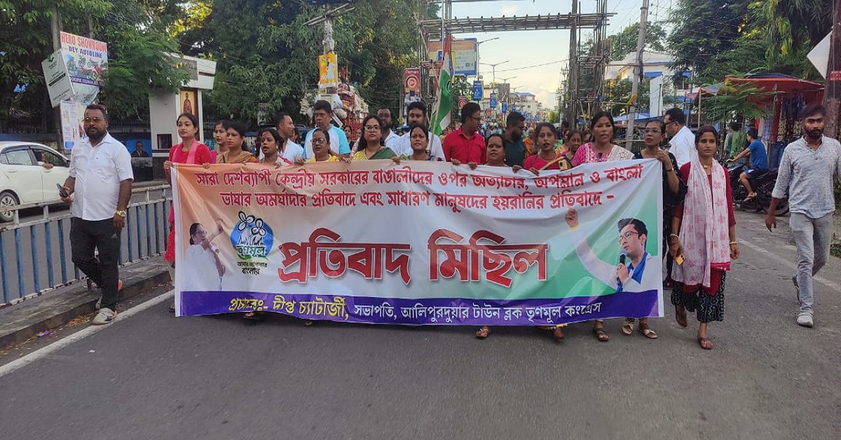 ব্যুরো রিপোর্ট : মেয়ো রোডে গান্ধীমূর্তির পাদদেশে ভাষা আন্দোলনের মঞ্চ সেনা নামিয়ে খুলে দেওয়া, বিজেপির নোংরা রাজনীতির প্রতিবাদে দলনেত্রী মমতা বন্দ্যোপাধ্যায়ের নির্দেশে গর্জে উঠেছে তৃণমূল। মঙ্গলবার কলকাতা-সহ রাজ্যের প্রতিটি জেলায় ব্লকে ব্লকে হল অবস্থান, মিছিল। হাওড়া জেলা (সদর) তৃণমূলের সভাপতি ও বিধায়ক গৌতম চৌধুরির নেতৃত্বে উত্তর হাওড়ার বাঁধাঘাট থেকে বামুনগাছি পর্যন্ত মিছিল হচ্ছে। জগৎবল্লভপুর কেন্দ্র তৃণমূলের উদ্যোগে হয়েছে মিছিল। ডোমজুড় কেন্দ্র তৃণমূলের উদ্যোগেও বিশাল প্রতিবাদ মিছিল হয়েছে।
