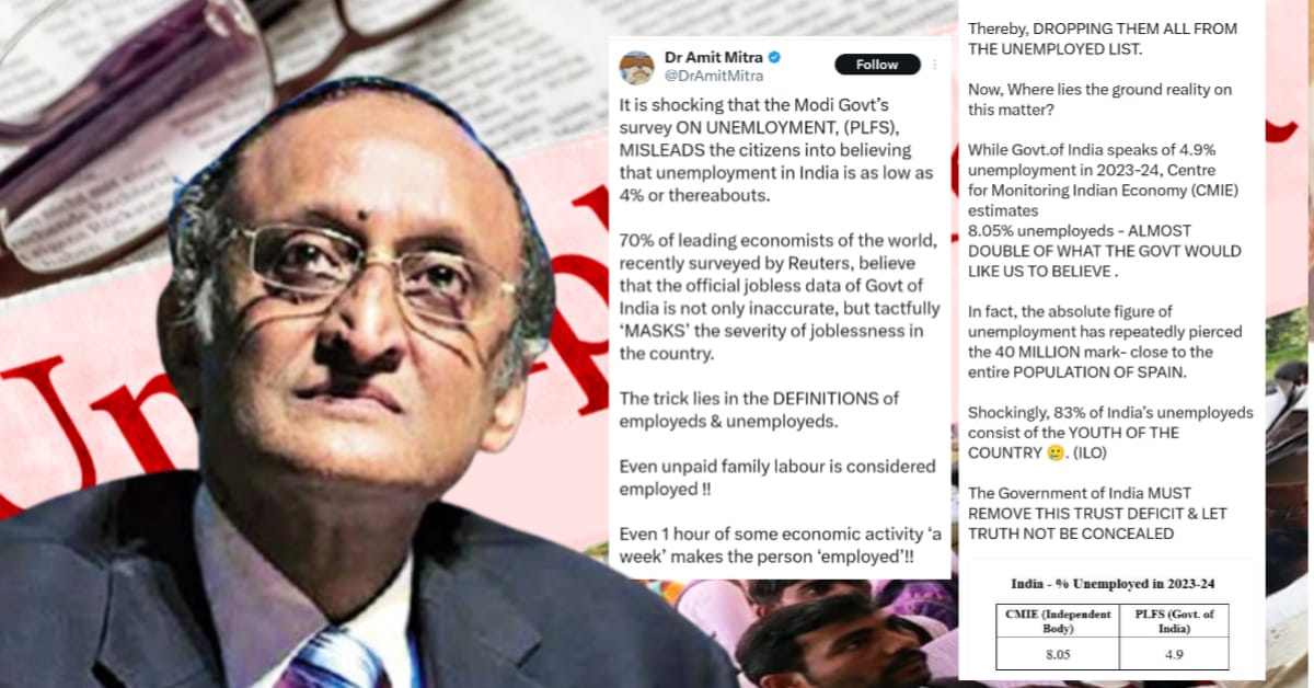 এই নিয়ে এক্স হ্যান্ডেলে তথ্য প্রকাশ করে অমিত মিত্র লেখেন, ”এটা খুবই আশ্চর্যজনক যে মোদী সরকারের বেকারত্ব সম্পর্কিত হিসেব (পিএলএফএস) একেবারেই বিভ্রান্তিকর। সেখানে বলা হচ্ছে ভারতে বেকারত্বের হার মাত্র ৪% বা তার কাছাকাছি। সম্প্রতি রয়টার্সের সমীক্ষায় বিশ্বের ৭০% শীর্ষস্থানীয় অর্থনীতিবিদ বিশ্বাস করেন যে ভারত সরকারের সরকারী বেকারত্বের তথ্য কেবল ভুল নয়, বরং কৌশলে দেশের বেকারত্বের তীব্রতাকে ‘ঢেকে’ রাখা হচ্ছে। কৌশলটি বেকারের সংজ্ঞার মধ্যেই রয়েছে। এমনকি বেতনহীন পরিবারকেও হিসেবে নিযুক্ত বলে গণ্য করা হচ্ছে !! ‘সপ্তাহে’ ১ ঘন্টার কাজেও সেই ব্যক্তিকে ‘কর্মসংস্থানপ্রাপ্ত’ হিসেবে দেখানো হচ্ছে!! এর ফলে, তাদের সকলকে বেকার তালিকা থেকে বাদ দেওয়া হচ্ছে। এই পরিসংখ্যানের বাস্তবতা কোথায়? ভারত সরকার ২০২৩-২৪ সালে ৪.৯% বেকারত্বের কথা বললেও, সেন্টার ফর মনিটরিং ইন্ডিয়ান ইকোনমি (CMIE) অনুমান করছে আসল পরিসংখ্যান ৮.০৫%। প্রকৃতপক্ষে, বেকারত্বের চূড়ান্ত সংখ্যা ৪০ মিলিয়নের সীমা অতিক্রম করেছে – যা স্পেনের সমগ্র জনসংখ্যার কাছাকাছি। আশ্চর্যজনকভাবে, ভারতের ৮৩% বেকার দেশের যুবসমাজ। ভারত সরকারকে এই আস্থার ঘাটতি দূর করতে হবে এবং প্রকৃত সত্য তথ্য প্রকাশ্যে আনতে হবে।”