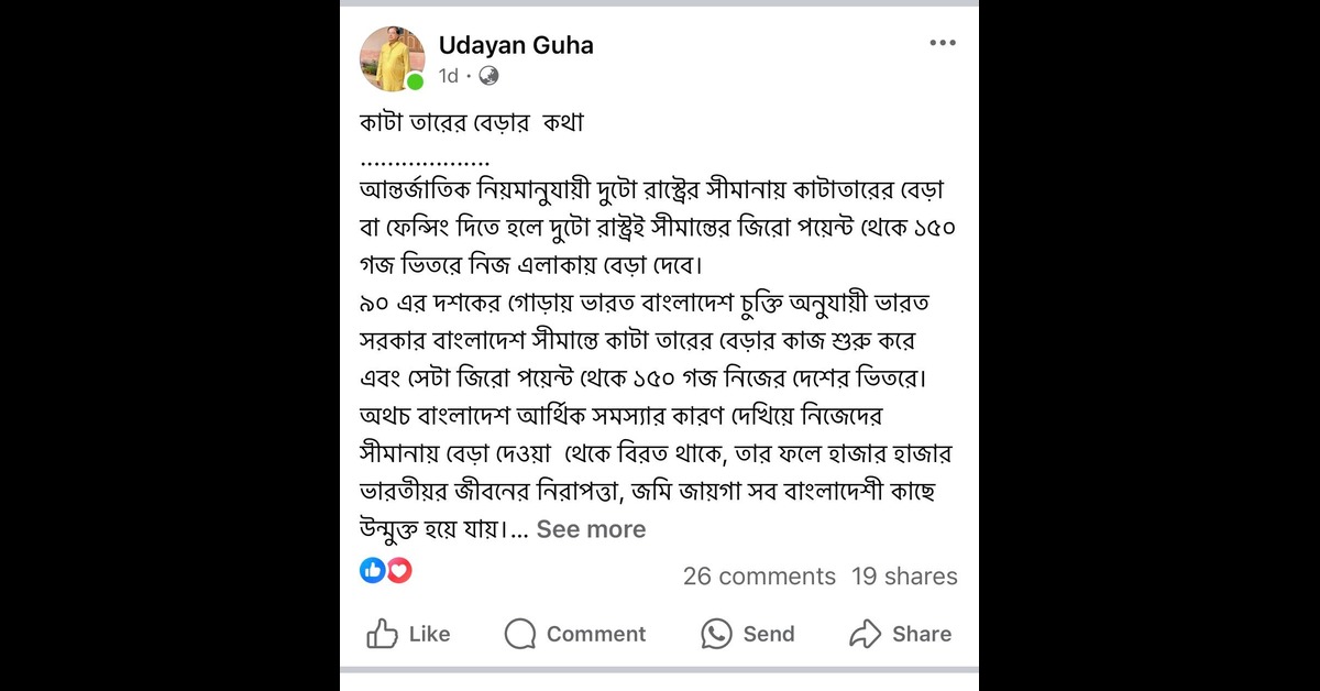 বারংবার বাংলাদেশিদের বিরুদ্ধে এ ধরনের অভিযোগ উঠলেও বিএসএফ উদাসীন বলে গুরুতর অভিযোগ তুলে সোশ্যাল মিডিয়ায় পোস্ট করেছেন উত্তরবঙ্গ উন্নয়ন মন্ত্রী উদয়ন গুহ। পরিস্থিতি মোকাবিলায় দিনহাটা ২ ব্লকের নাজিরহাট ২ গ্রাম পঞ্চায়েতের সীমান্ত নোটাফেলা এলাকায় গিয়ে বিএসএফের ঊর্ধ্বতন কর্তৃপক্ষ, গ্রামবাসী, স্থানীয় জনপ্রতিনিধিদের সঙ্গে বৈঠক করেছেন দিনহাটা মহকুমা শাসক বিধুশেখর, দিনহাটা ২ ব্লক বিডিও নীতীশ তামাং, দিনহাটা পুলিশের এসডিপিও ধীমান মিত্র।
