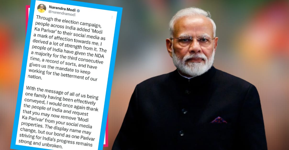 এই অবস্থায় নিজের এক্স হ্যান্ডেলে প্রধানমন্ত্রী নরেন্দ্র মোদী সমস্ত বিজেপি নেতা, মন্ত্রী ও কর্মীদের কাছে অনুরোধ করেছেন, সোশ্যাল মিডিয়ার তাঁরা যেন নামের পাশ থেকে “মোদী কি পরিবার” বাক্যটি মুছে দেন। কারণ হিসেবে বোঝাই যাচ্ছে এখন সব কথায় NDA বলতে হচ্ছে, যার অর্থ জোট সরকার। মোদী সরকার নয়।