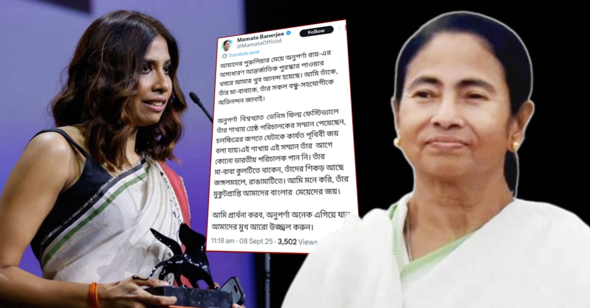 এই মর্মে বাংলার মুখ্যমন্ত্রী মমতা বন্দ্যোপাধ্যায় নিজের এক্স হ্যান্ডেলে শুভেচ্ছাবার্তা জানিয়ে লেখেন, ”আমাদের পুরুলিয়ার মেয়ে অনুপর্ণা রায়-এর অসাধারণ আন্তর্জাতিক পুরস্কার পাওয়ার খবরে আমার খুব আনন্দ হয়েছে। আমি তাঁকে, তাঁর মা-বাবাকে, তাঁর সকল বন্ধু-সহযোগীকে অভিনন্দন জানাই।