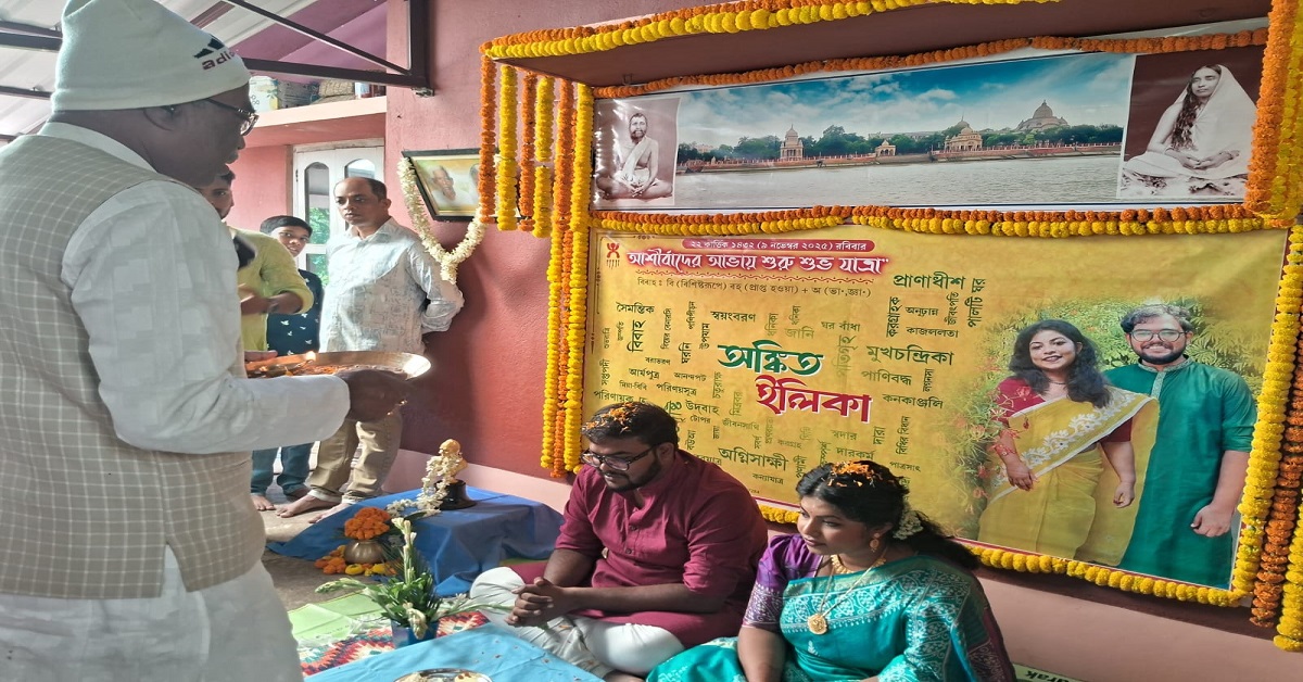 তাঁদের মতে, পাত্রপাত্রীর স্বাবলম্বী হওয়ার পিছনে আসল কারণ তিনিই। আর তাই বিদ্যাসাগরকে সামনে রেখেই পালিত হল এই বিবাহের প্রথম পর্ব। গত রবিবার নন্দগোপালবাবুর মেয়ে পেশায় আইনজীবী ইলিখা পাত্রের বিয়ের প্রথম পর্ব অর্থাৎ আশীর্বাদ অনুষ্ঠানের নাম দেওয়া হয় ‘আশীর্বাদের আভায় শুরু শুভযাত্রা।’ পিছনে ব্যানারে লেখা প্রাণাধীশ, মুখচন্দ্রিকা, কাজললতার মতো বিভিন্ন শব্দ। আর সেই ব্যানারের নিচেই আশীর্বাদ পর্বে বসেন হবু বরকনে অঙ্কিত ও ইলিখা। তাঁদের ডান পাশেই আসন পেতে বসানো হয় ঈশ্বরচন্দ্র বিদ্যাসাগরের মূর্তি। সেই মূর্তির সামনেই চলে গোটা আশীর্বাদ পর্ব। বিয়ের আসরে বাংলার মনীষী ও সমাজ সংস্কারক বিদ্যাসাগরকে এভাবে দেখে অভিভূত অনেকেই। কন্যা ইলিখা আইনে স্নাতকোত্তর, কলকাতায় প্র্যাকটিস করেন। তাঁর বাবা দীর্ঘদিন শিক্ষকতা করেন। পাত্র মধ্যমগ্রামের বাসিন্দা পেশার ইঞ্জিনিয়ার অঙ্কিত চৌধুরি। কন্যার পিতার এই ব্যতিক্রমী সিদ্ধান্তে অভিভূত বরের বাড়ির সদস্যেরাও। তাঁর বাবার এই উদ্যোগ নিয়ে পাত্রী ইলিখা বলেন, বাবার বিভিন্ন ধরনের ব্যতিক্রমী ভাবনা আমাদের চিরকাল অনুপ্রাণিত করেছে। তাঁর এই সিদ্ধান্ত শুধু দৃষ্টান্ত নয়, নারীশিক্ষার প্রতি নতুন অঙ্গীকার। এ বিষয়ে নন্দগোপালবাবুর বক্তব্য, মেয়েরা যেভাবে নিজেদের পায়ে দাঁড়িয়ে শিখরে পৌঁছচ্ছে তার অন্যতম কারিগরই হলেন বিদ্যাসাগর। তাঁর প্রতি সম্মান যাতে সব সময় বজায় থাকে তাই এমন আয়োজন। এই মানুষটির কাছে আমাদের মাথা নত করতেই হয়।