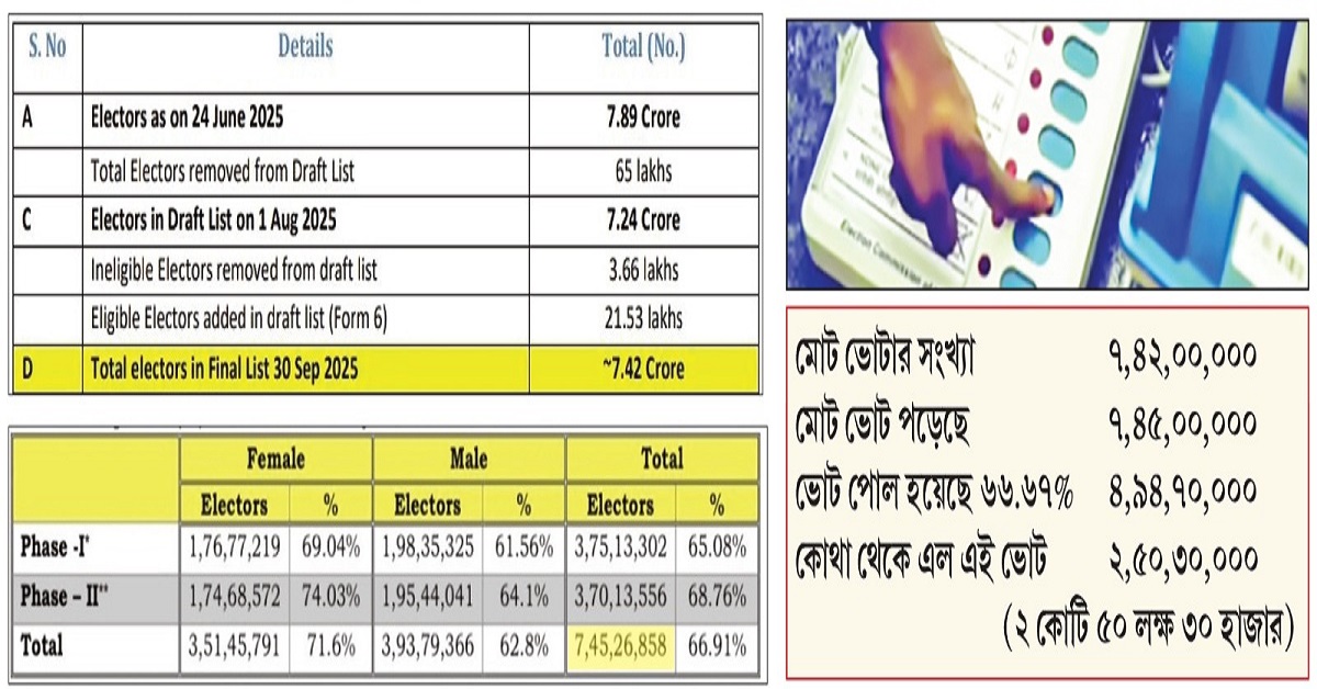 নির্বাচনের ফলাফল প্রকাশিত হয়েছে ১৪ নভেম্বর। তার আগে ভোটদানের সর্বশেষ তথ্য কমিশন পেশ করেছে ১১ নভেম্বর, নির্বাচনের দ্বিতীয় দফার ভোটের শেষে। তাতে দেখা যাচ্ছে, বিহারে ভোট দিয়েছেন ৭ কোটি ৪৫ লক্ষ ২৬ হাজারের বেশি ভোটার। এসআইআর-এর পরে কমিশন প্রকাশিত মোট ভোটারের সংখ্যার থেকে যা প্রায় ৩ লক্ষ বেশি!