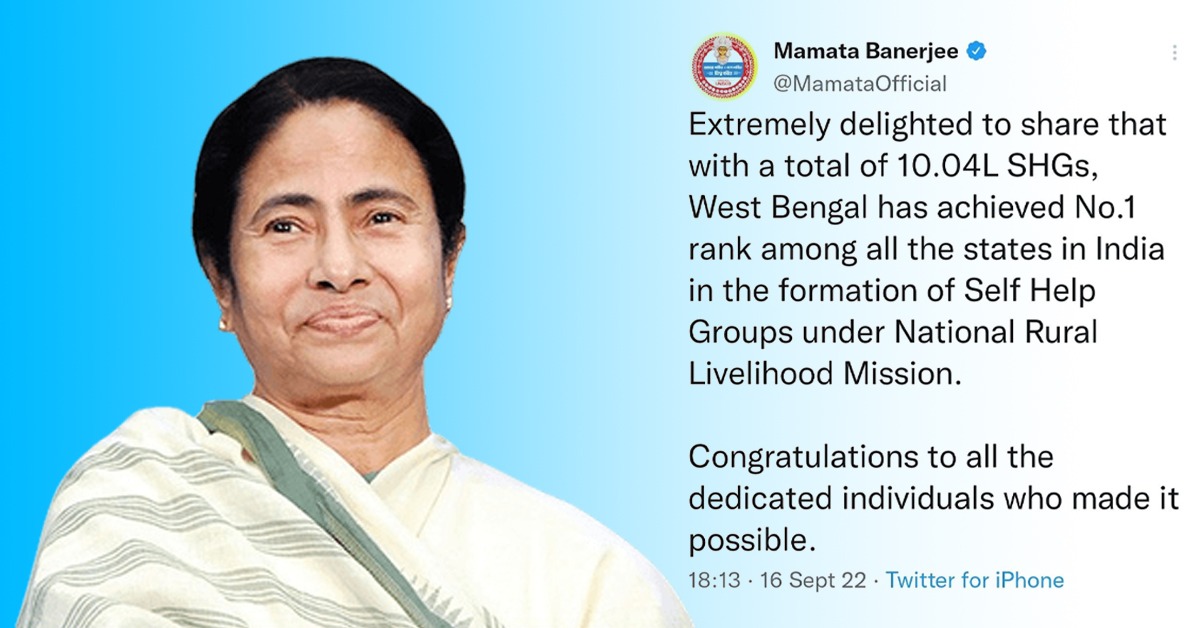 টুইট করে মুখ্যমন্ত্রী (Self Help Groups- Mamata Banerjee) জানিয়েছেন, “মোট ১০লক্ষ ৪ হাজার স্বনির্ভর গোষ্ঠীর সঙ্গে শেয়ার করতে পেরে অত্যন্ত আনন্দিত যে, ন্যাশনাল রুরাল লাইভলিহুড মিশনের অধীনে স্বনির্ভর গোষ্ঠী গঠনে পশ্চিমবঙ্গ ভারতের সমস্ত রাজ্যের মধ্যে ১ নম্বর স্থান অর্জন করেছে।” তিনি স্বনির্ভর গোষ্ঠীর সঙ্গে যুক্ত সকলে অভিনন্দন জানিয়েছেন।