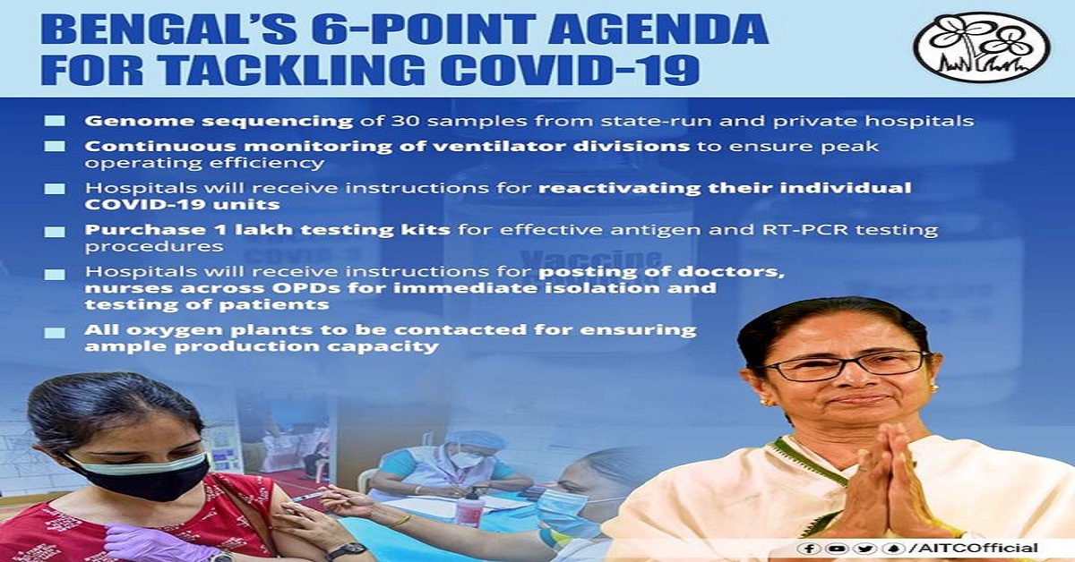 আগামীকাল কেন্দ্রীয় স্বাস্থ্য মন্ত্রীর বৈঠক বসতে চলেছে সব রাজ্যের সঙ্গে। তারপরেই রাজ্য বসবে বৈঠকে বলেই জানা গিয়েছে। তৃণমূল কংগ্রেসের টুইট বার্তায় এর মধ্যেই জানানো হয়, ‘মুখ্যমন্ত্রী মমতা বন্দ্যোপাধ্যায়ের অধীনে বাংলা কোভিড-১৯ ক্ষেত্রে যেকোনও উত্থানের মুখোমুখি হতে প্রস্তুত। ৬-দফা এজেন্ডা জিনোমিক নজরদারি, অক্সিজেন সরবরাহের ক্ষমতা, পরীক্ষা এবং জরুরী প্রতিক্রিয়ার উপর দৃষ্টি রয়েছে। বাংলার বাসিন্দাদের নিরাপত্তা GoWB-এর অগ্রাধিকার!’