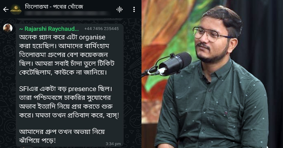 এই মর্মে একটি হোয়াটসঅ্যাপ গ্রুপের চ্যাটও সামনে এনেছে তৃণমূল আইটি সেল। অক্সফোর্ডে কেলগ কলেজে মুখ্যমন্ত্রী মমতা বন্দ্যোপাধ্যায়ের অনুষ্ঠানে হুজ্জুতি করার পরিকল্পনা যে অনেক আগে থেকেই করা হয়েছিল, এই হোয়াটসঅ্যাপ চ্যাট তার প্রমাণ। সেই হোয়াটসঅ্যাপ চ্যাটে লেখা হয়েছে, অনেক প্ল্যান করে এটা অর্গানাইজ করা হয়েছিল। আমাদের বার্মিংহাম তিলোত্তমা গ্রুপের বেশ কয়েকজন ছিল। আমরা সবাই চাঁদা তুলে টিকিট কেটেছিলাম কাউকে না জানিয়ে। তাদের মধ্যে আরও নানা কথোপকথন চালানো হয়েছে এই হোয়াটসঅ্যাপ গ্রুপে।