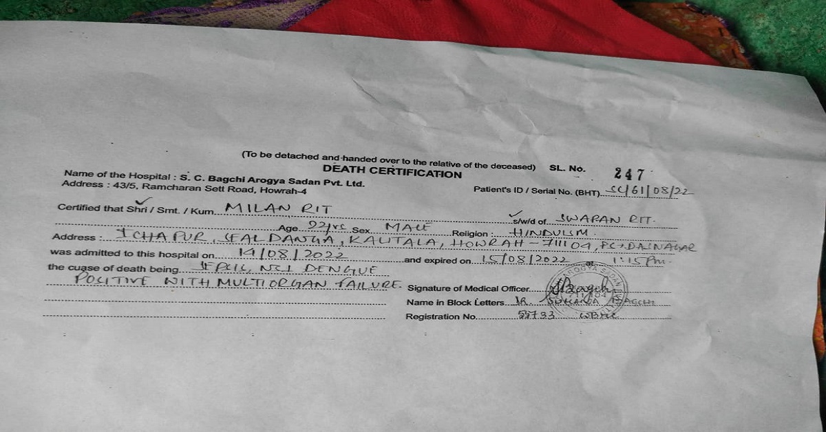 মৃতের ডেথ সার্টিফিকেটে ডেঙ্গু পজিটিভ ও মাল্টি অরগ্যান ফেলিওর থেকে মৃত্যু হয়েছে বলে উল্লেখ করা হয়েছে। তবে এই প্রসঙ্গে হাওড়া কর্পোরেশনের প্রশাসকমণ্ডলীর চেয়ারপার্সন ডাঃ সুজয় চক্রবর্তী জানান, ‘ডেঙ্গিতেই ওই যুবকের মৃত্যু হয়েছে নাকি অন্য কোনও কারণে মৃত্যু তা আমরা খোঁজ নিয়ে দেখছি। বিষয়টি আমাদের এখনও জানা নেই। কর্পোরেশনের স্বাস্থ্য বিভাগ থেকেও খোঁজ নেওয়া হচ্ছে।’ নজর রাখা হচ্ছে পরিস্থিতির উপর।